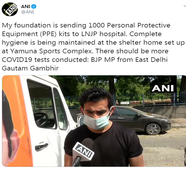 पूर्वी दिल्ली से भाजपा सांसद गौतम गंभीर कोरोना वायरस के खिलाफ लड़ाई में सरकार का पूरा सहयोग कर रहे हैं। गंभीर ने शुक्रवार को बताया कि उनके फाउंडेशन की तरफ से दिल्ली के लोकनायक अस्पताल (LNJP) को एक हजार व्यक्तिगत सुरक्षा उपकरण (पीपीई) किट भेजा जा रहा है।