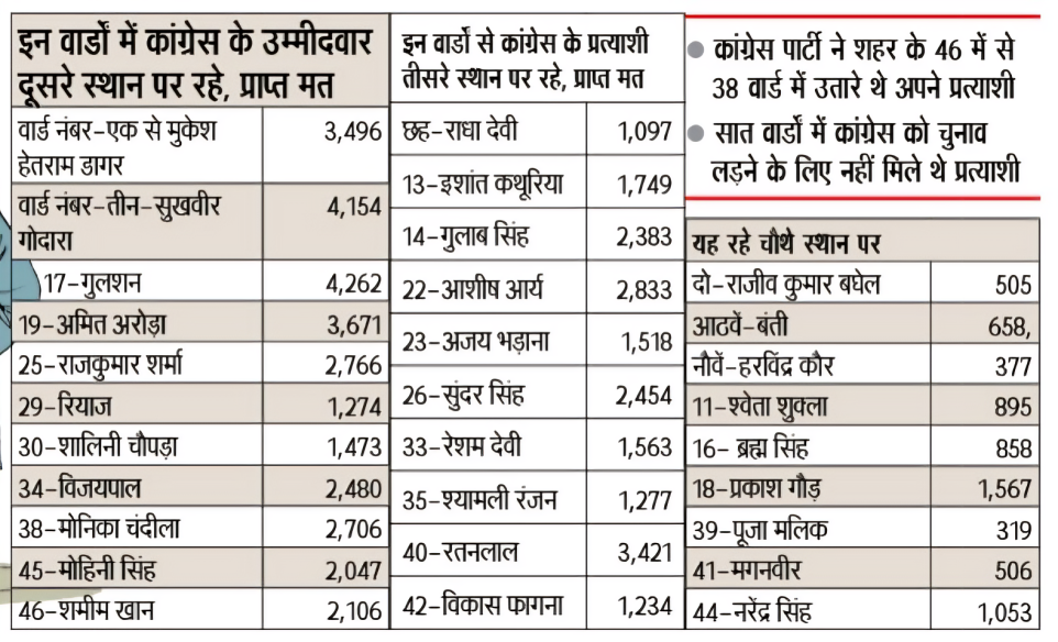 इन वार्डों पर दूसरे स्थान पर रहे कांग्रेस के उम्मीदवार